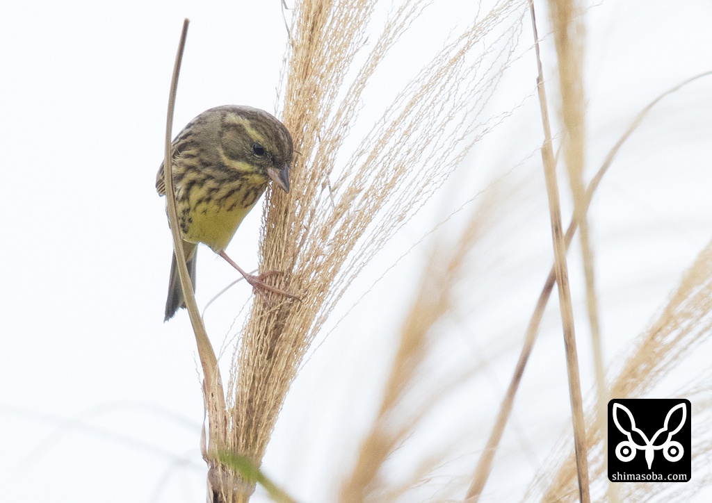 アオジのメス。ススキの種子を食っています。
