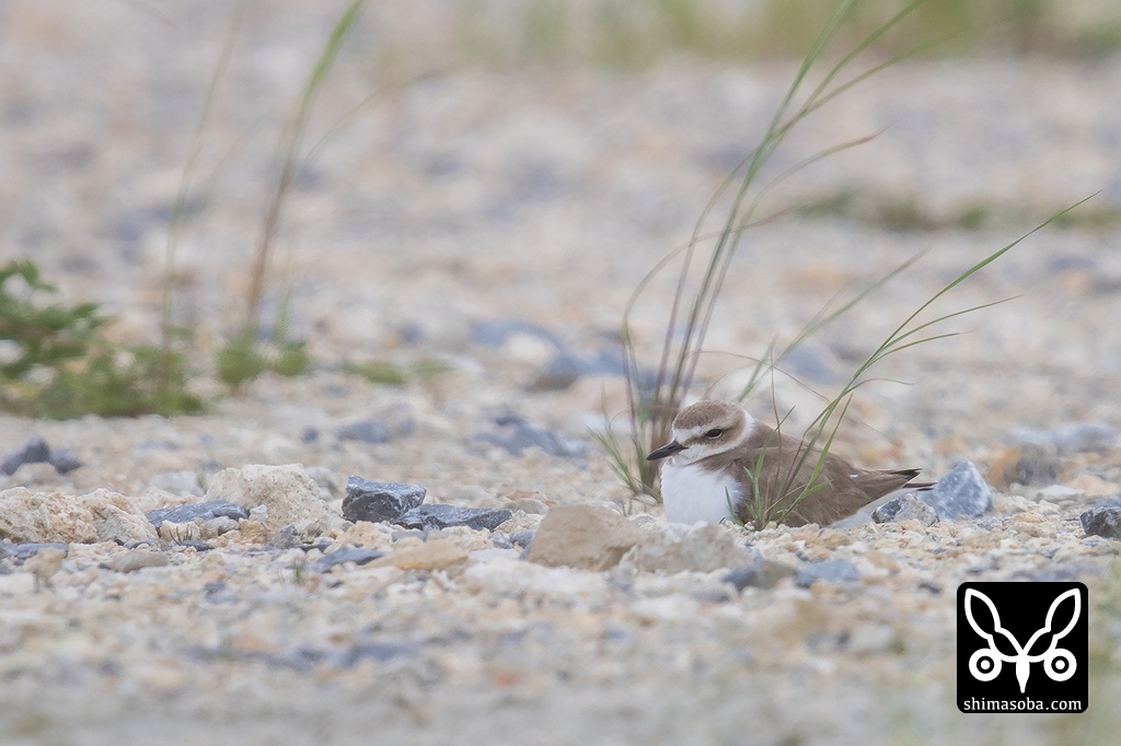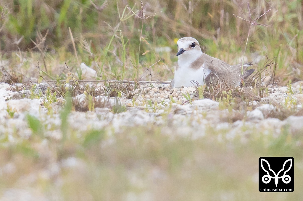 草の根元で抱卵するシロチドリ。