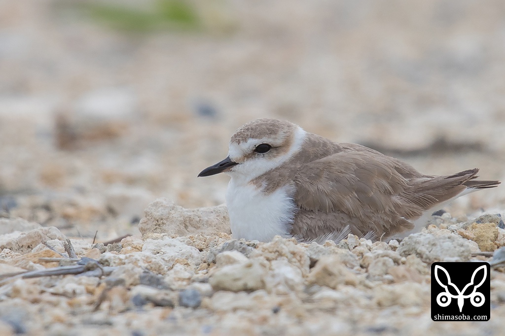 砂の上で抱卵するシロチドリのメス。