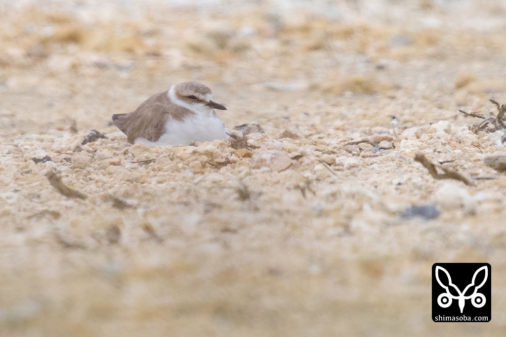 こちらも砂の上で営巣するシロチドリ。この辺りは、野良猫を見ることがあるが無事に育つことを祈る。