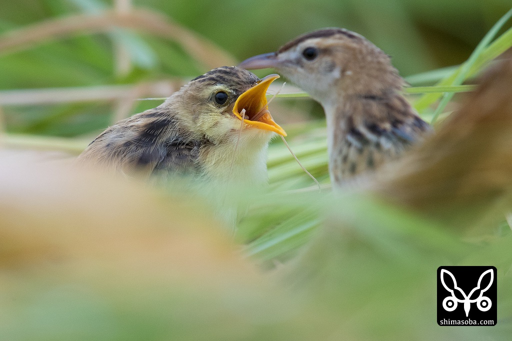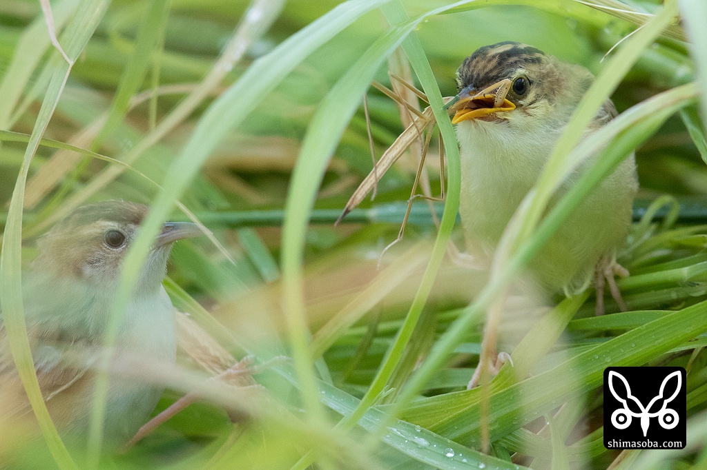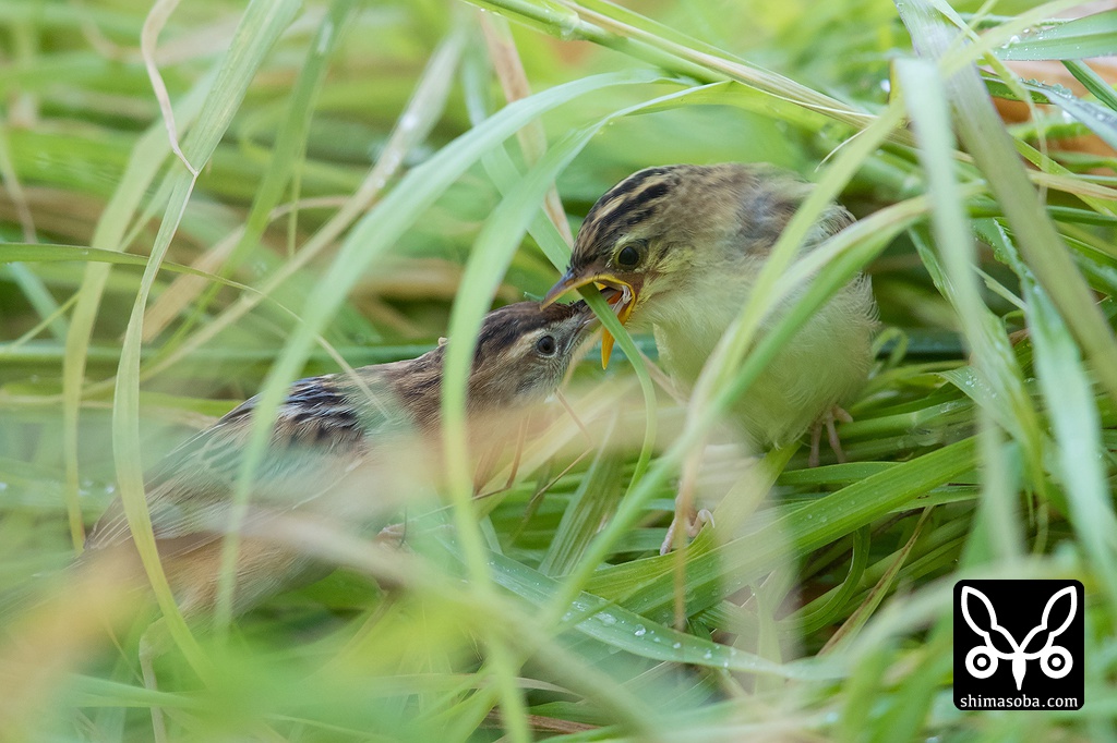 草むらの中で餌をもらうセッカのヒナ。