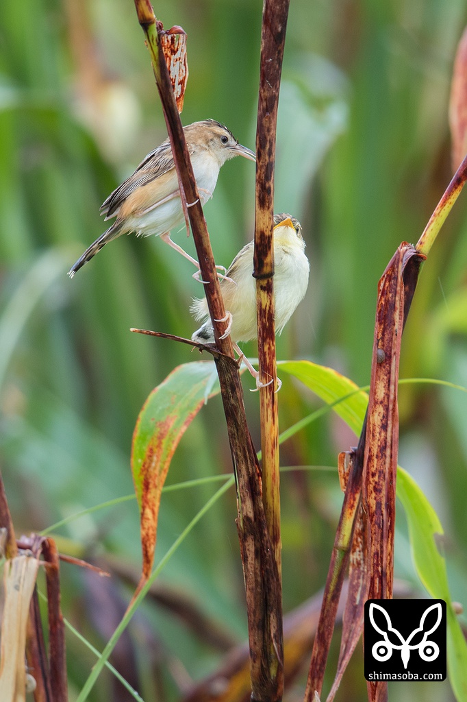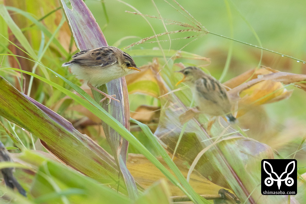セッカの親鳥(上)とヒナ。こんな開けたところに止まるのはまれ。