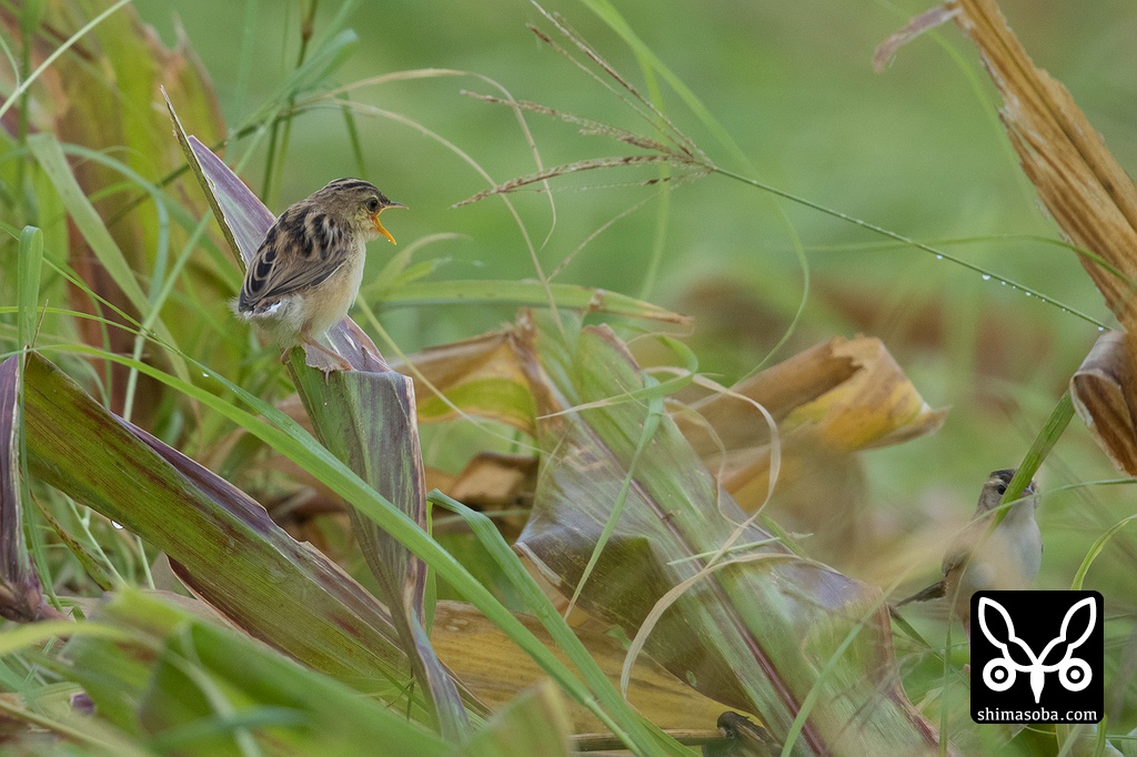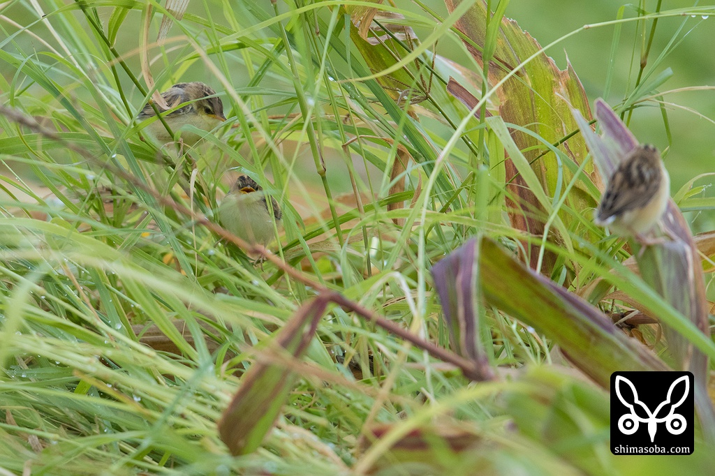 牧草地に巣立ちから1〜2日経過したセッカのヒナが5羽いました。セッカは一夫多妻なのでオスは子育てに参加しません。メス親はヒナへの餌を運びに、オス親は縄張りに入ってきたよそ者のセッカを追い払うのに大忙しでした。