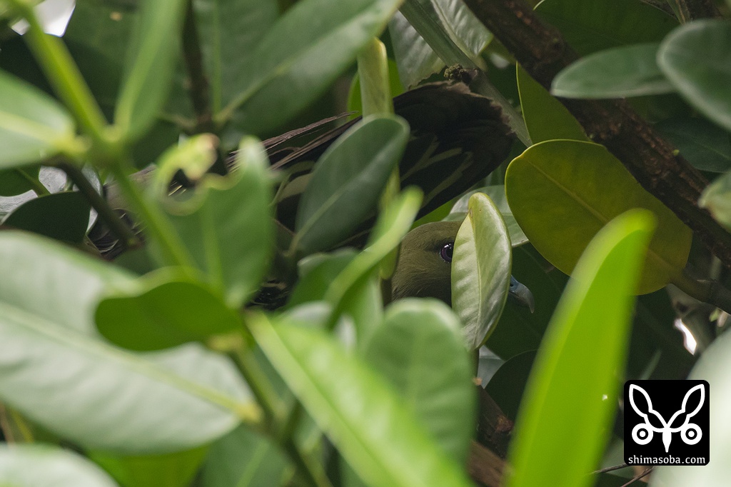 オスの尾羽とメスの顔の一部が葉っぱのわずかな隙間から見えます。ズアカアオバトはいつも込み入った葉っぱの間に巣を作ります。