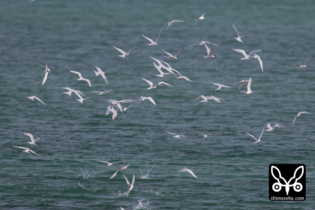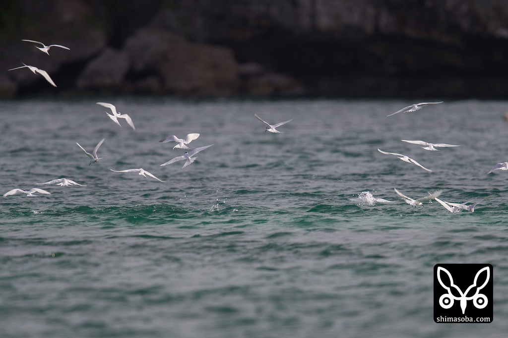 アジサシの仲間もこのころから増えだし、きょうは、エリグロアジサシとベニアジサシの100羽以上の群れが、うるま市の海中道路から見られました。また、近くの漁港でも数十羽の群れがいくつか確認できた。