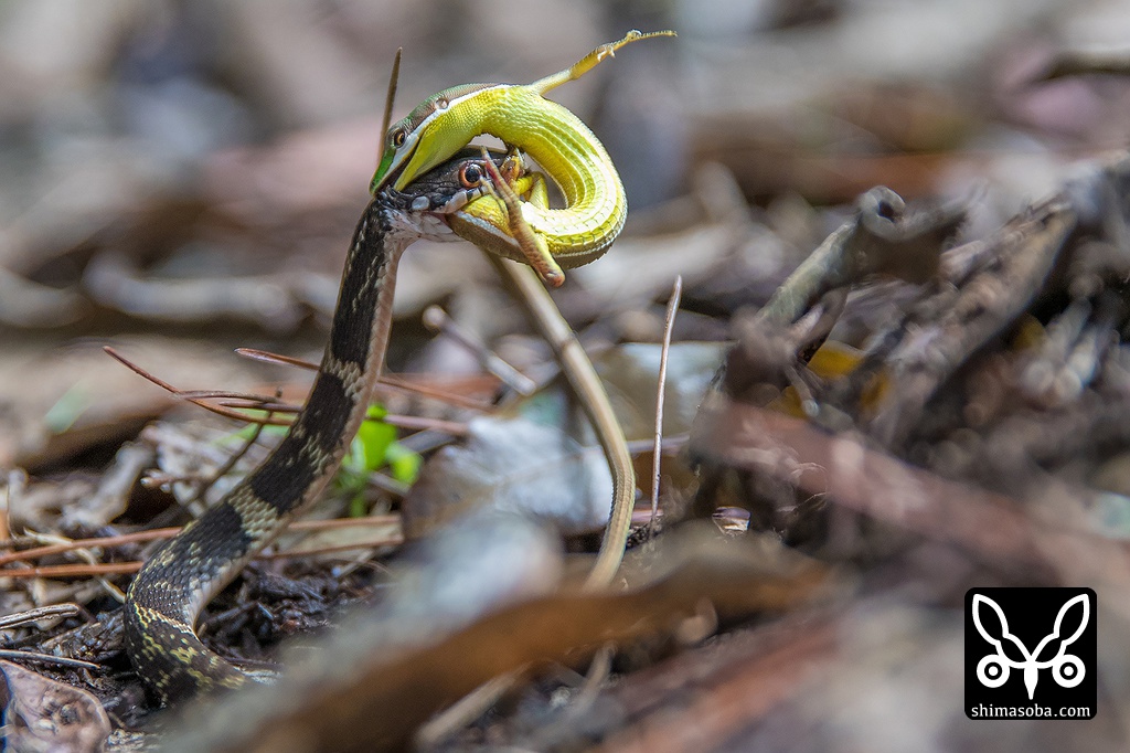 道端でガラスヒバァとアオカナヘビが戦っていました。アオカナヘビがぐったりしたところでガラスヒバァがアオカナヘビをくわえたまま茂みに入ってしまい、呑み込むところまでは確認できなかった。