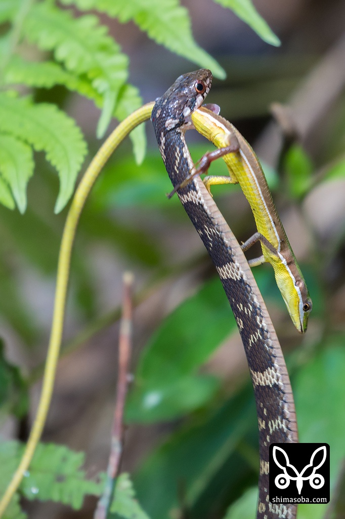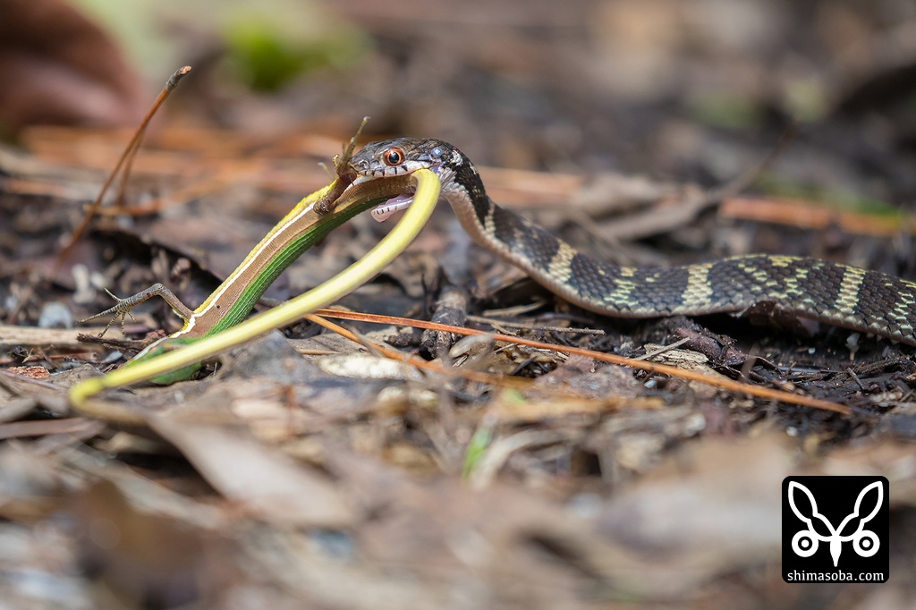 アオカナヘビがぐったりしたところで、ガラスヒバァは、首を高々と持ち上げ、アオカナヘビを茂みに運んで行った。