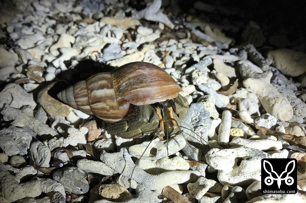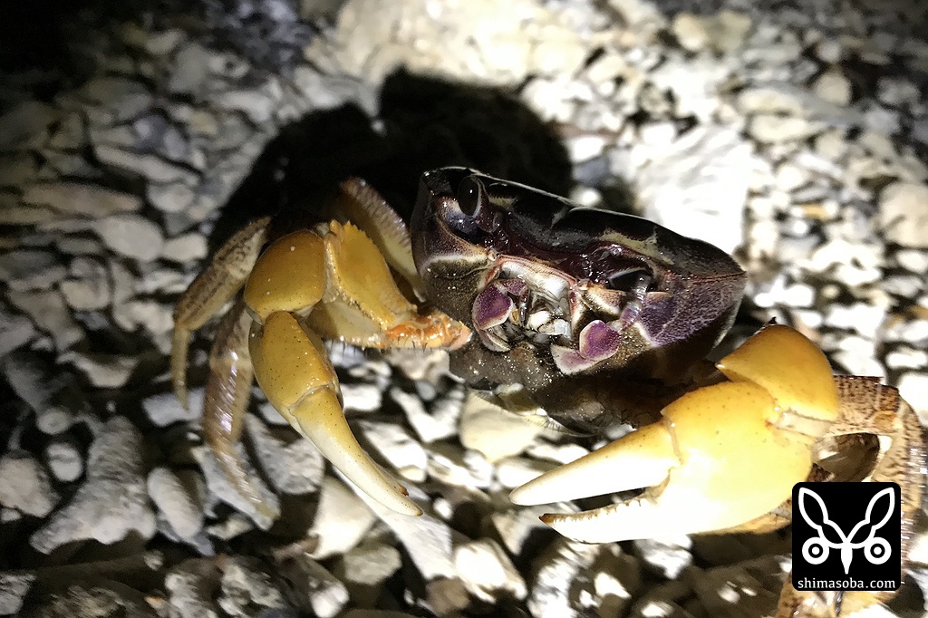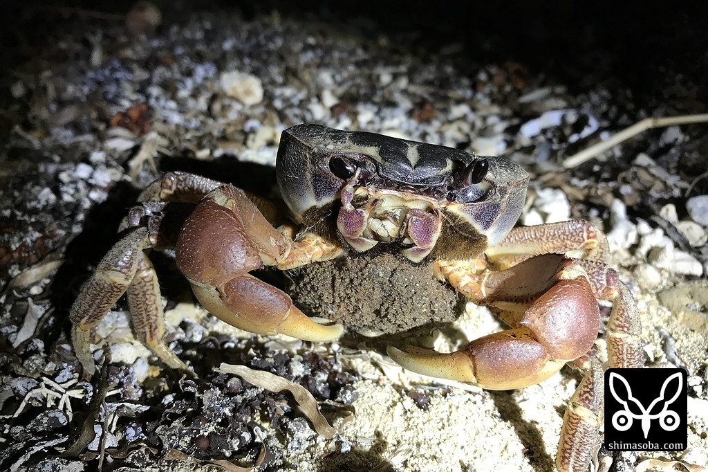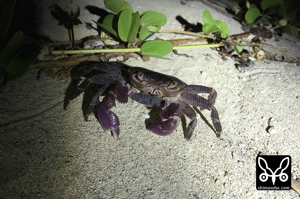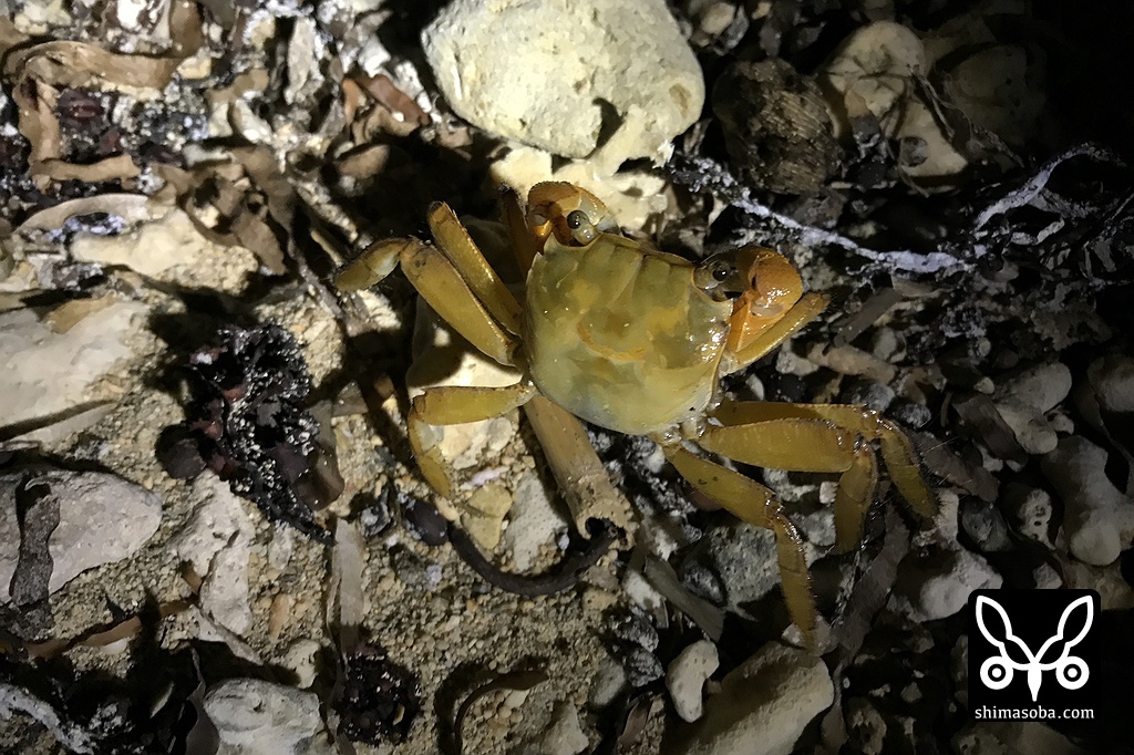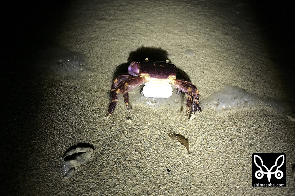 海に向かうオカガニ。オカガニは、波打ち際から1〜2メートル沖合まで入ってしまうので写真は撮れなかった。懐中電灯で照らして観察していると、海に入って数秒後に水中で体を震わせ放仔した。カニの周りが煙幕を張ったように幼生に覆われていた。