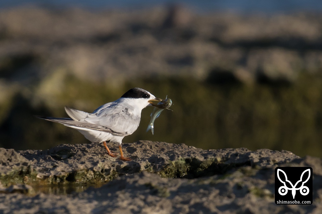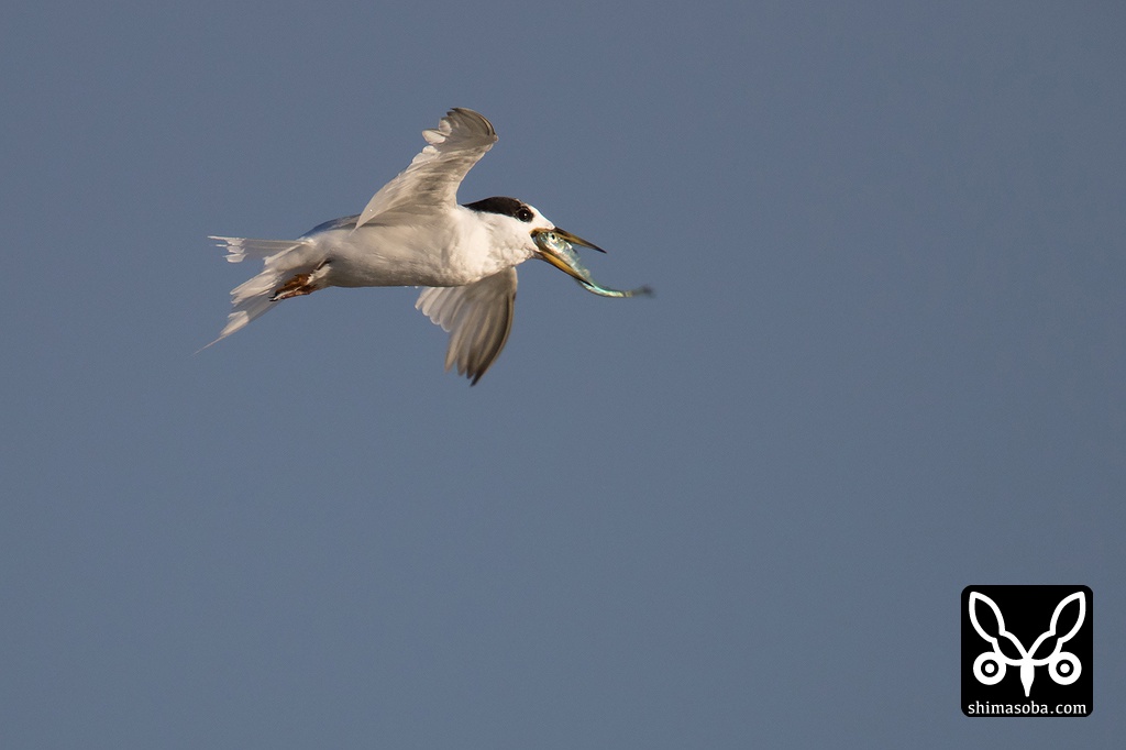 コアジサシの親鳥がボラの稚魚らしきのを捕まえてきた。