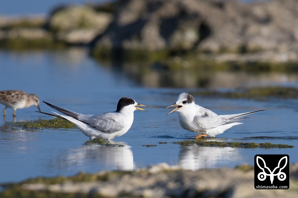 親鳥に餌をねだるコアジサシの幼鳥。