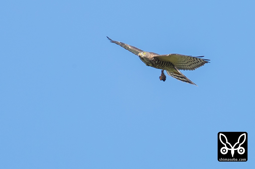 アカハラダカの幼鳥。足にはリュウキュウアブラゼミを掴んでいます。嗉嚢が膨らんでいるので餌は十分に食べているようですが、食べきれない分は長旅の栄養補給の為に携帯していくのでしょうか。