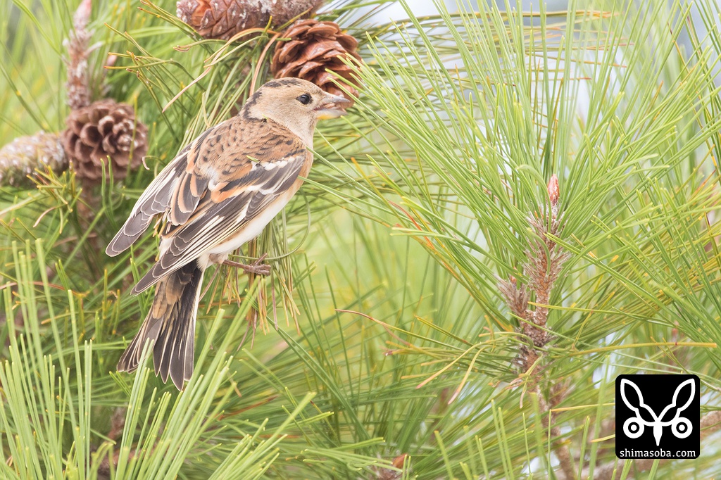 松ぼっくりから実を取り出すアトリのメス。数十羽のアトリが一斉に松の実を食うと、実を覆う薄皮が粉雪のようにひらひらと舞っていました。