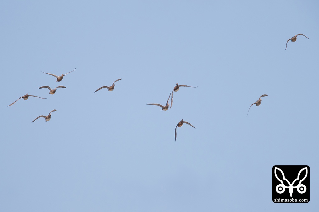 ヒドリガモ9羽とハシビロガモ1羽の群れが空からやってきたのですが、着水しては飛行機の音に驚いて飛び回っていました。