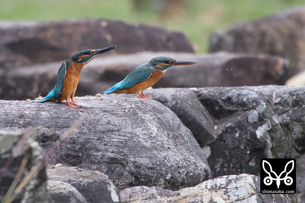 カワセミのオス(左)とメス。お互い連れ立って行動しながら求愛ダンスのようなこともやっていた。こんな小さな池で繁殖するのか?