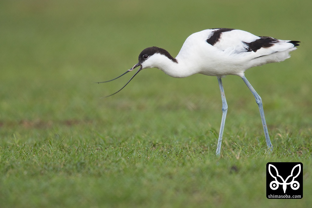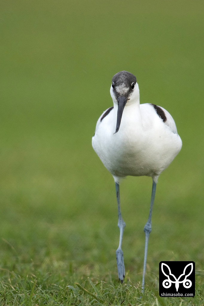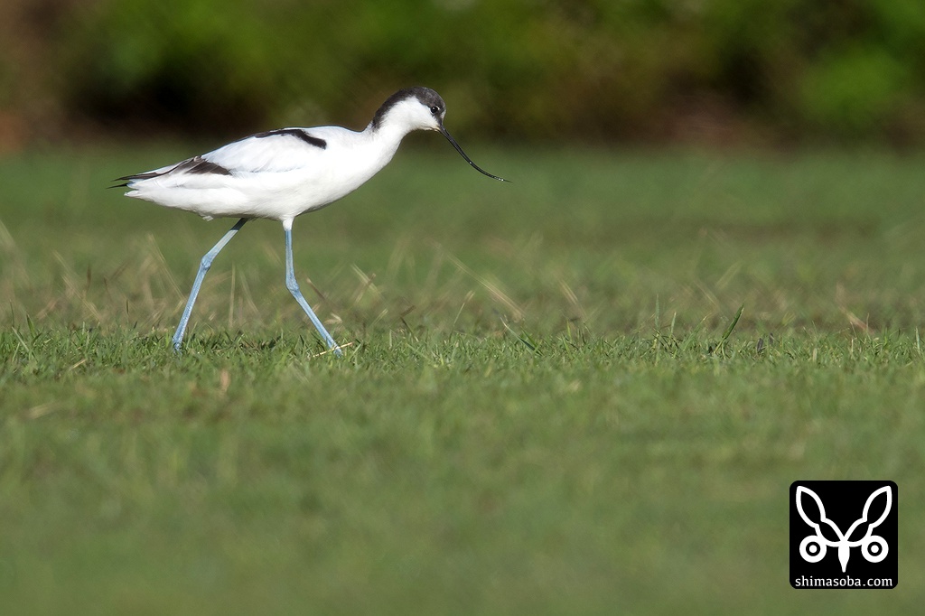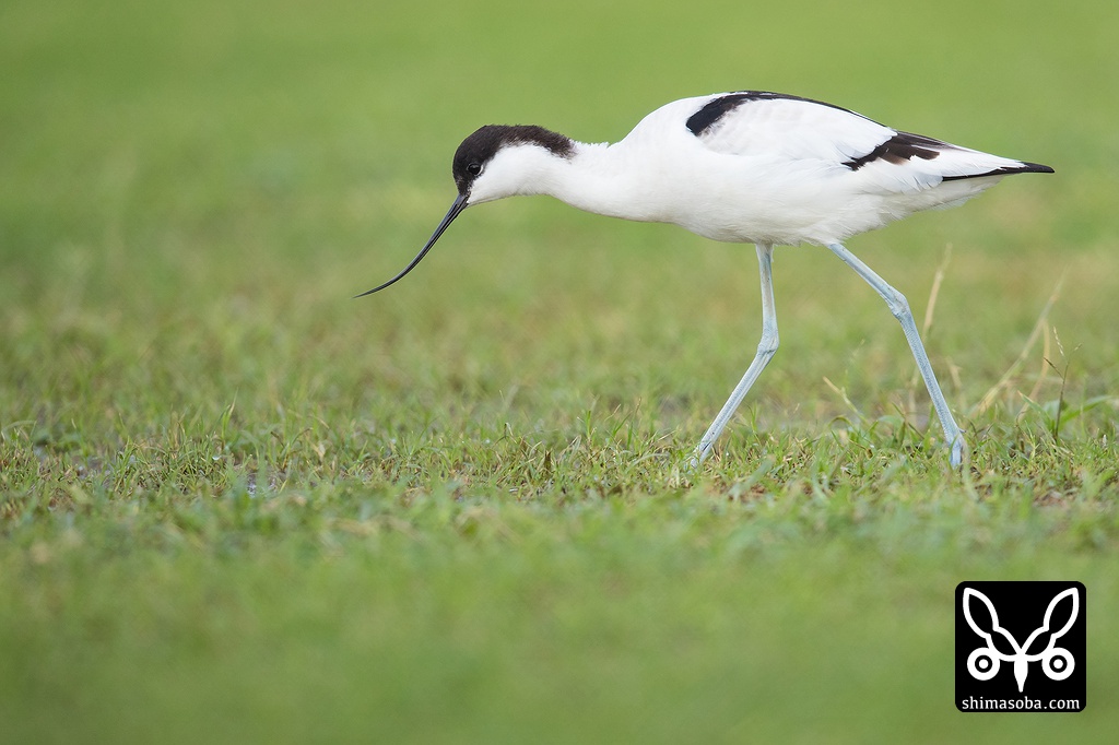 グラウンドの短く刈り込まれた芝生にソリハシセイタカシギ成鳥。