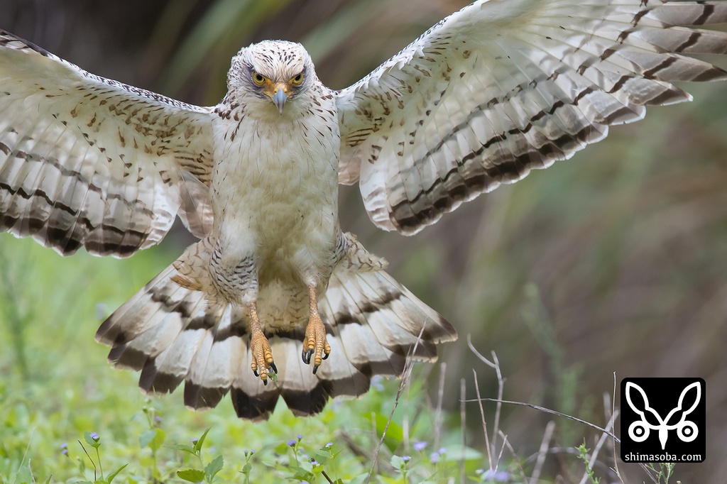 カンムリワシ幼鳥の急降下。ブレーキをかけ始めているので小翼羽がピンっと立っています。