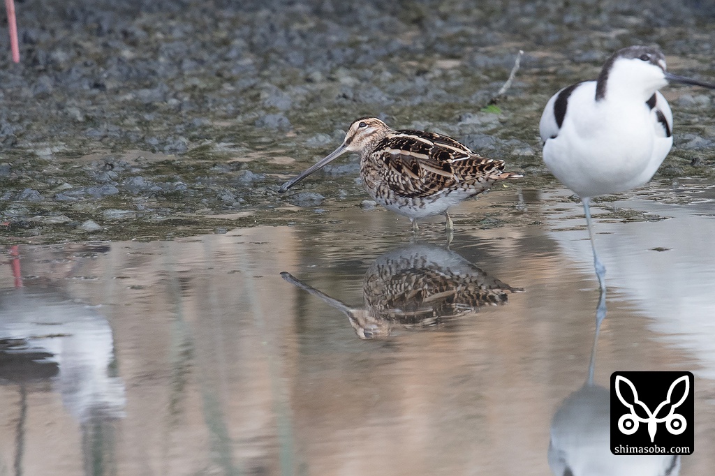 タシギは10羽ほどが葦原の境目にいた。