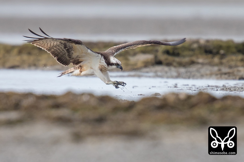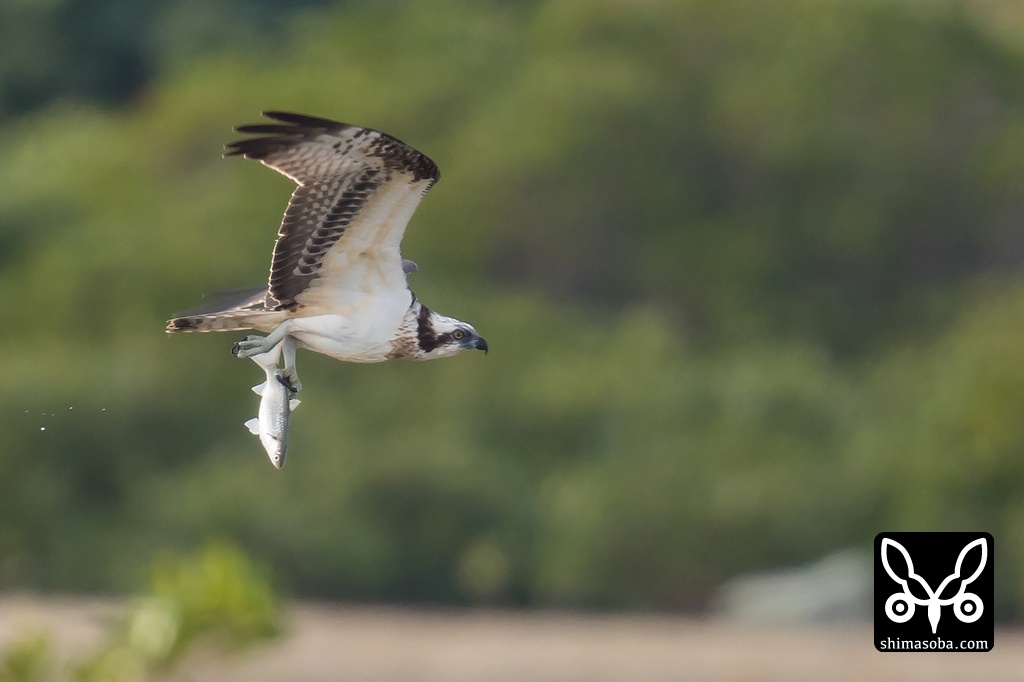 具志干潟はミサゴの良好な狩り場となっています。今日は、4羽のミサゴがドボンドボンと飛び込み、ボラやフエフキダイの仲間などを捕まえていた。狩りの上手な個体は、2匹のボラを一度の飛び込みで掴んでいました。