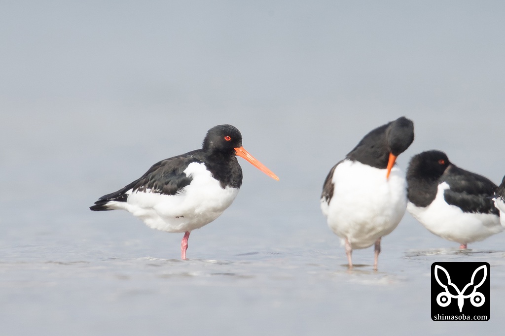 約20羽のミヤコドリの群れには、成鳥と第1回冬羽の幼鳥が混ざっていました。右は第1回冬羽。