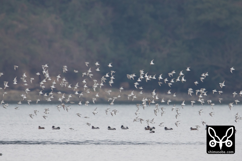 ミユビシギとハマシギは数百羽の群れが舞っていた。水面に浮かぶかもはヨシガモ。