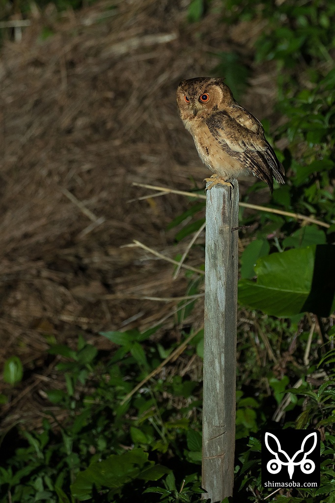 畑の杭にとまるオオコノハズク。見つけたときは遠かったけど、しばらくすると近くまでやってきた。