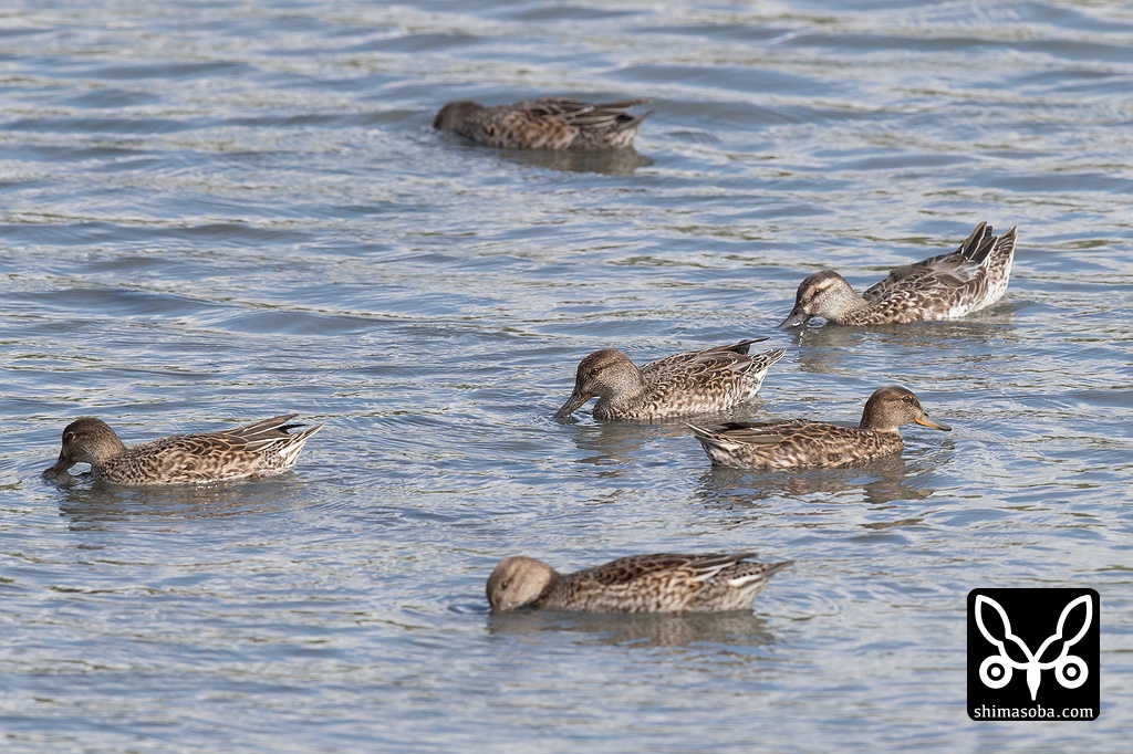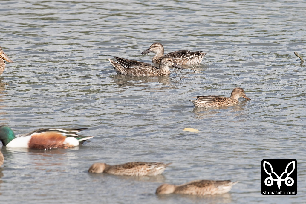 シマアジの2羽は、たくさんのコガモの群れの中でもお互い離れないよう近くにいた。