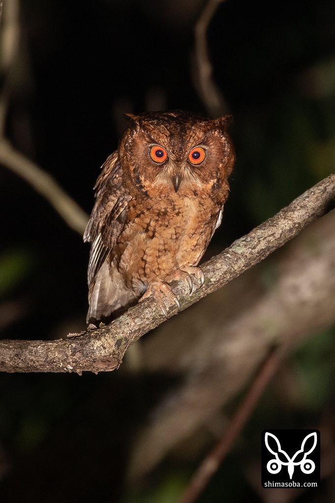 車を止めて車外に出ると、さっそく聞きなれない鳴き声。アオバズクやコノハズクとは全く違い、2度ほど聞いたことのあるリュウキュウオオコノハズクの声に似ているけど、あんなにはしゃがれ声じゃない。でも、美声のオオコノハズクに違いないと懐中電灯を片手に探してみると藪の中にオオコノハズクがいました!! 出会い頭だったので驚かせてしまい飛び去るも戻ってくる予感がしたのでしばらく待つとやはり同じ枝に戻ってきました。ここが彼の餌場らしい。