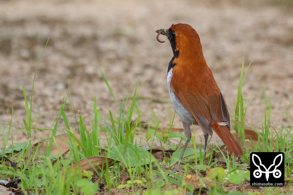 小さなミミズと昆虫をくわえるホントウアカヒゲのオス。藪の中に運んでいくのですが、巣は確認できず。