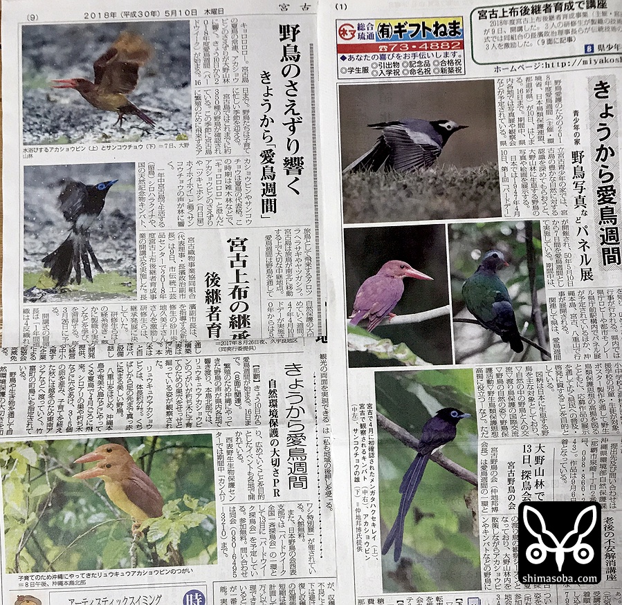 宮古新報(右)、宮古毎日(左上)、八重山毎日も愛鳥週間を紹介。宮古新報は気合いが入ってるなー!!