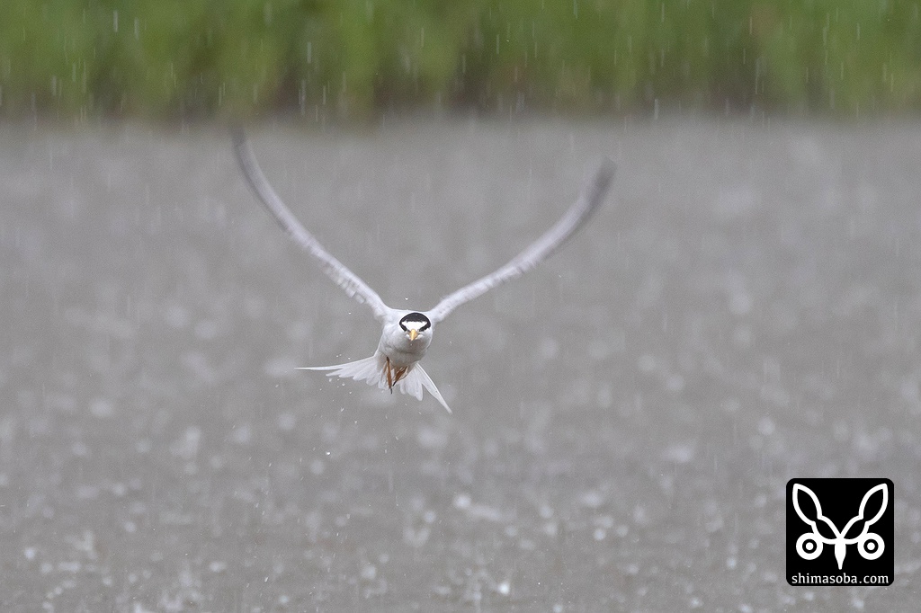 コアジサシを見ていると雲行きが怪しくなり、土砂降りに見舞われた。傘をさして撮ったコアジサシ。^^;