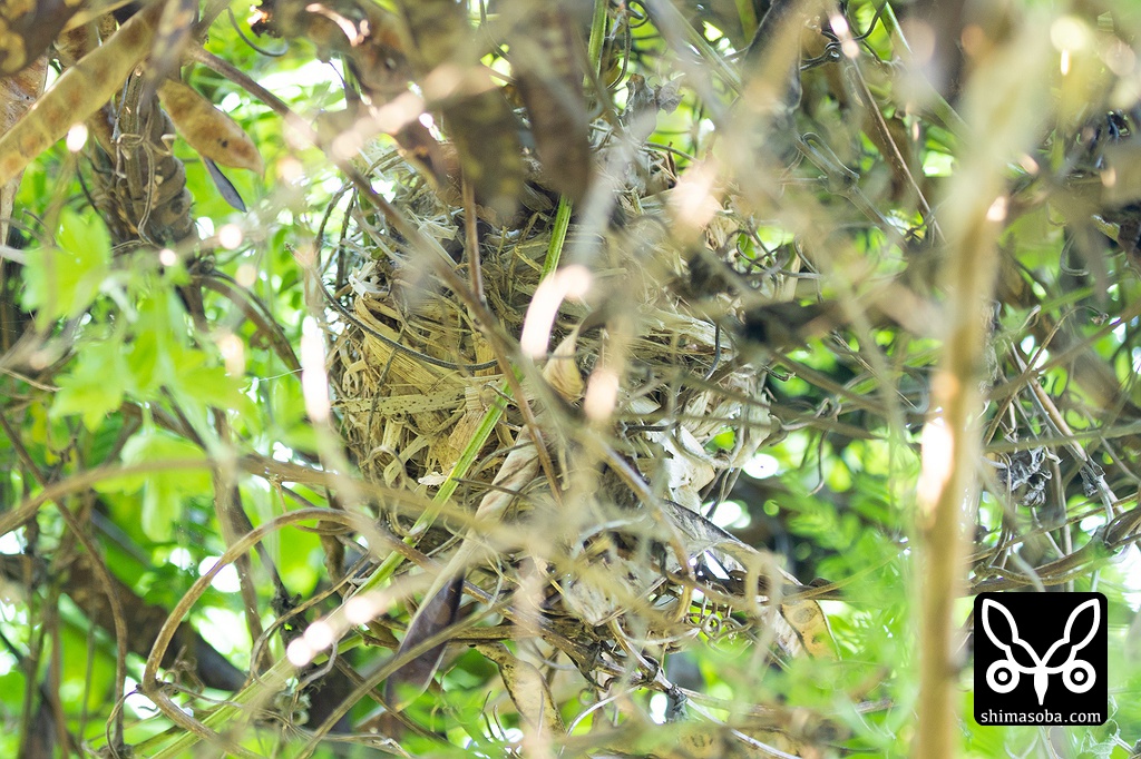 気づかずに巣の真下を通ったらヒヨドリが飛び出した。抱卵中の模様。ヒヨドリの巣っていつもこんな感じのごちゃごちゃしたところに作ってある。