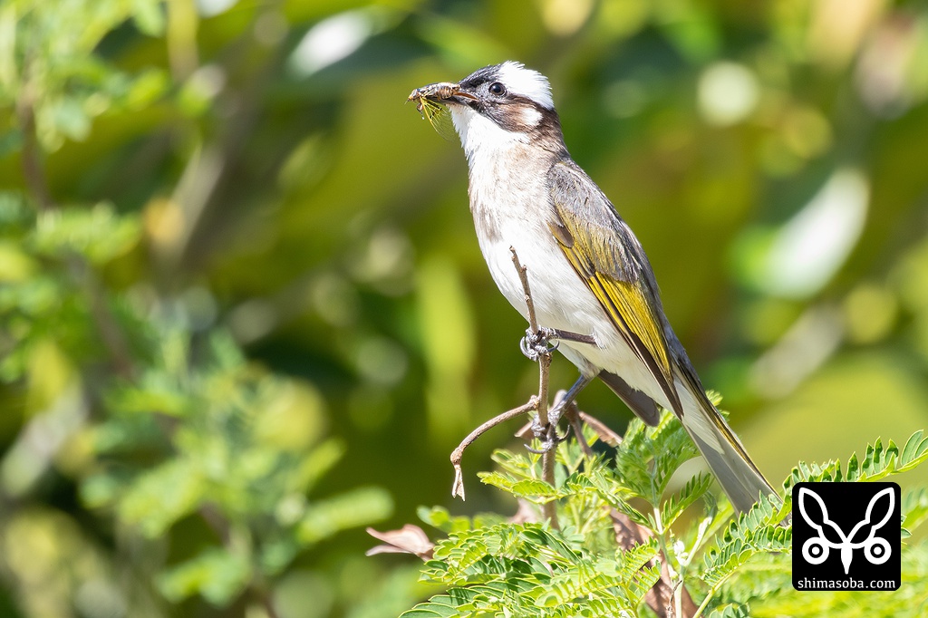 シロガシラはヒナに餌を運んでいた。くわえているのはイワサキクサゼミ。