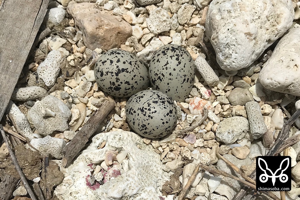 サンゴのかけらの上にシロチドリの卵が三つ。散歩の人も歩く海岸なので踏まれないか心配。