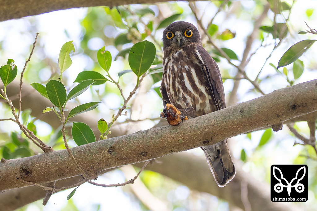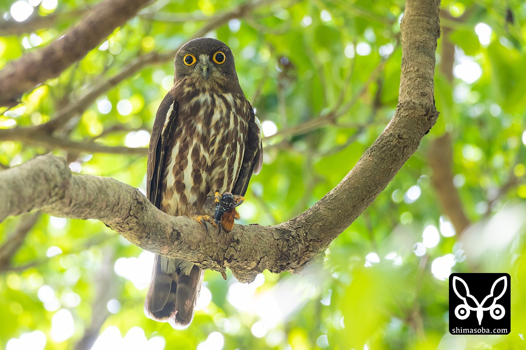 リュウキュウアブラゼミを捕まえたアオバズクのオス。
