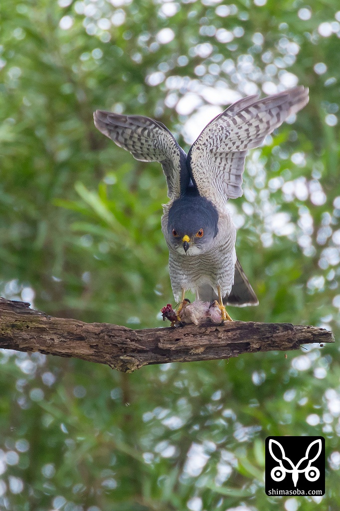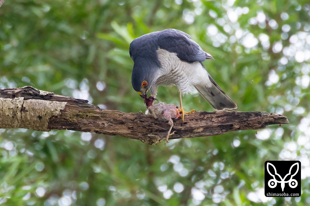 ツミのオスが獲物を調理する。イソヒヨドリの巣立ちビナと思われる。