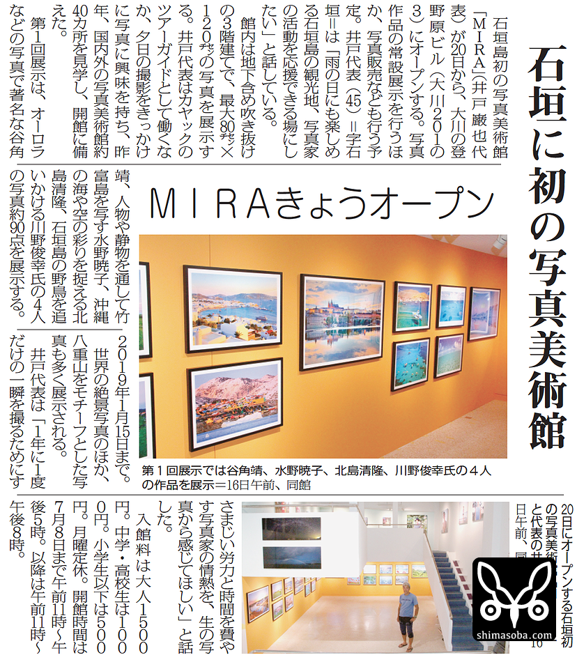 6月20日、石垣島で初めての写真美術館「 MIRA 」がオープンしました。記念すべくオープニング展示には、 石垣島ネイチャーガイドサービススポッター 代表の川野さんの写真も展示されます。世界的な写真家や、沖縄では誰もが知っている写真家と肩を並べての展示です。