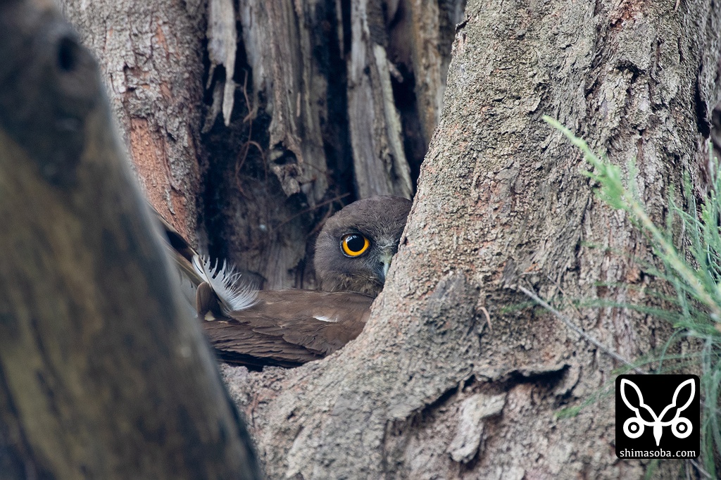 樹洞の入り口を塞ぐように座るアオバズクのメス。