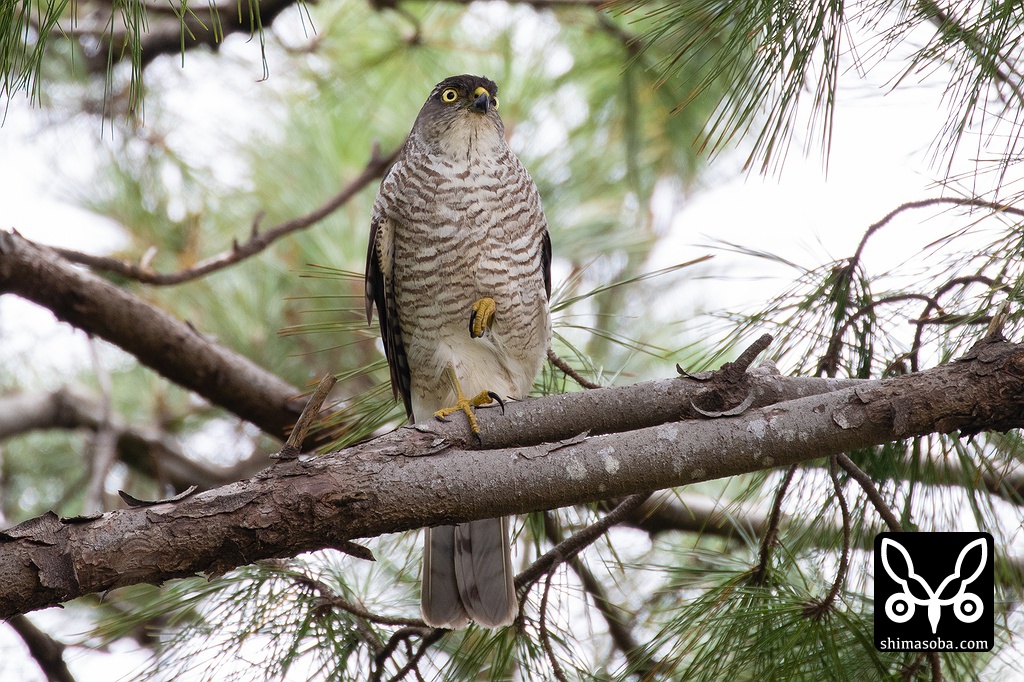 ツミは、メスがいつものリュウキュウマツから見張りをしていた。ヒナたちはコバテイシの葉の陰で昼寝中。