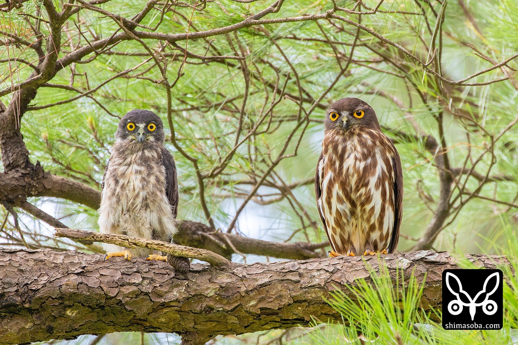 親子で並んだアオバズク。左が巣立ったヒナで右がオス親。