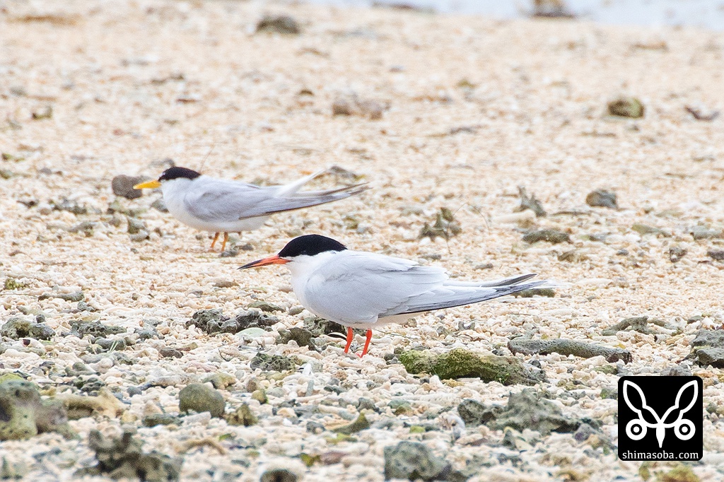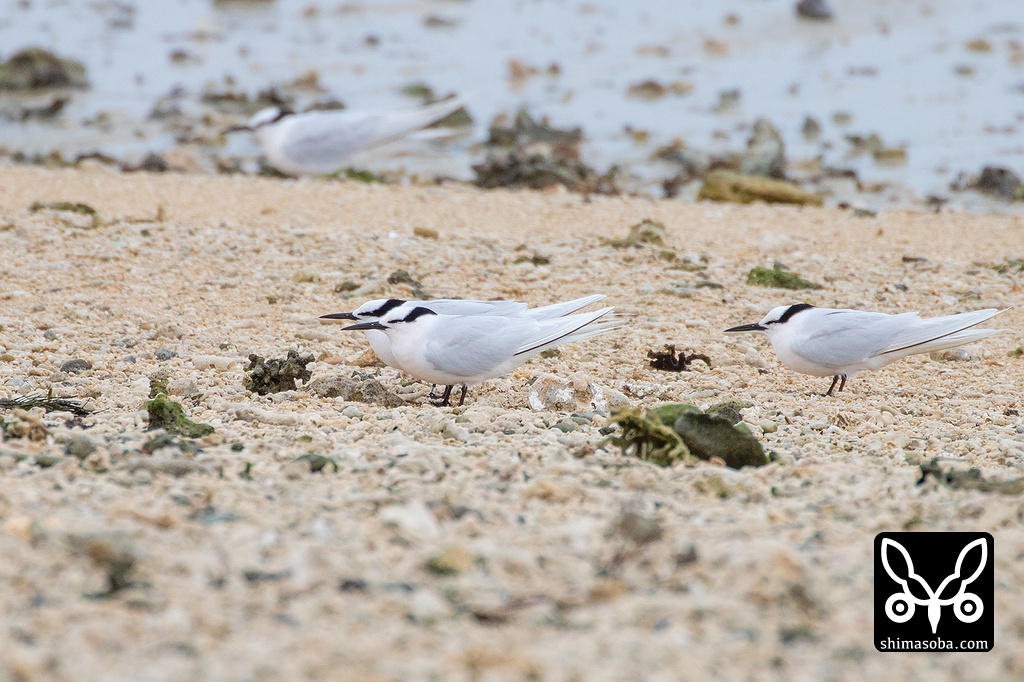 近くにはエリグロアジサシも休んでいた。真ん中奥の個体は、メタルリングを装着していますが読めず。