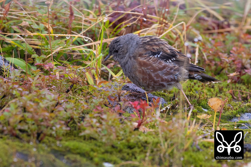 イワヒバリ成鳥。イワヒバリは数羽の群れで移動しながら雨の中、餌を拾っていた。