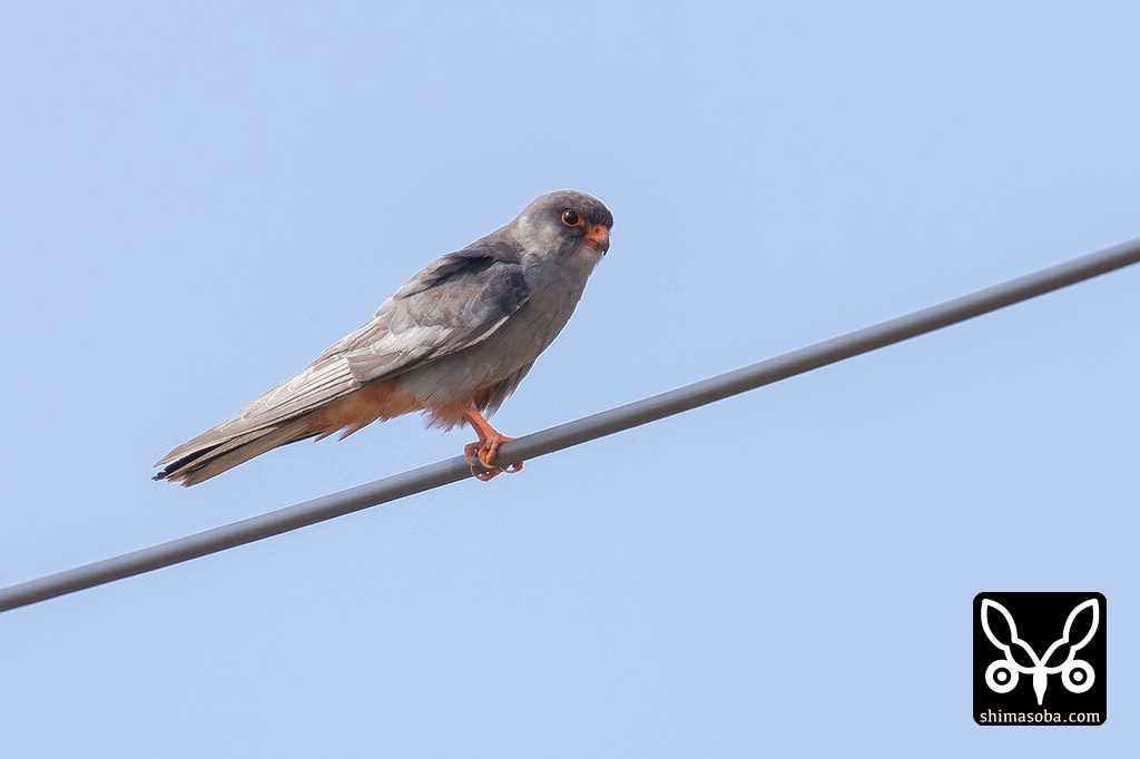 4日ほど前に沖縄本島南部で発見されたアカアシチョウゲンボウを探してきました。当初の場所より北西へ1キロほど離れた農耕地でネズミやトンボなどを捕まえていました。畑を右手に見ながら集落内の道路を走っていると100メートル以上離れた電線に何か止まっています。これはと思い双眼鏡でのぞいてみると青灰色が美しいアカアシチョウゲンボウの成鳥オスでした。