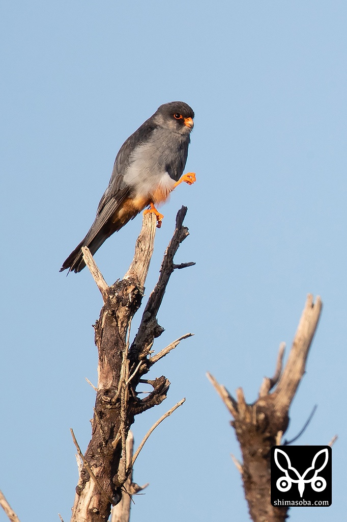 朝日を浴びて落ち着いた様子のアカアシチョウゲンボウの成鳥オス。