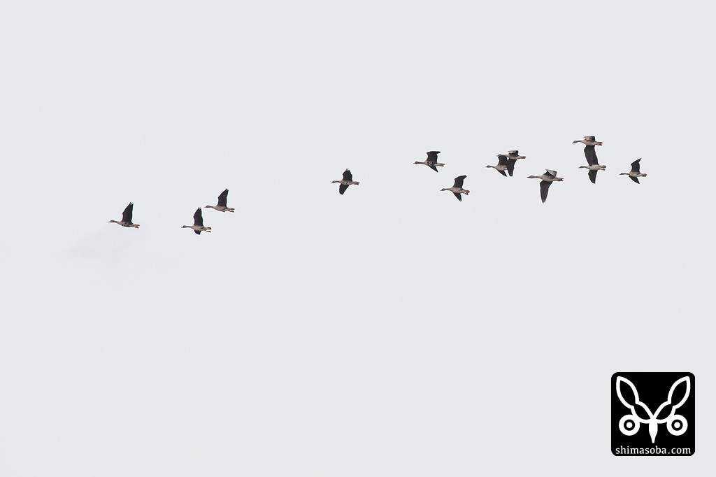 夕方、ダムからマガン11羽とヒシクイ1羽の群れが田んぼに帰ってきた。ヒシクイは後ろから4羽目。マガンより一回り大きいですね。