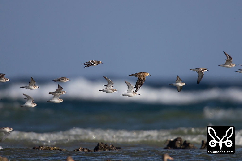 ムナグロ、キョウジョシギ、ハマシギ、メダイチドリ、シロチドリの群れ。