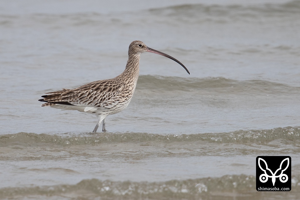 潮が満ちてきて浅瀬の砂浜で休んでいたダイシャクシギ。
