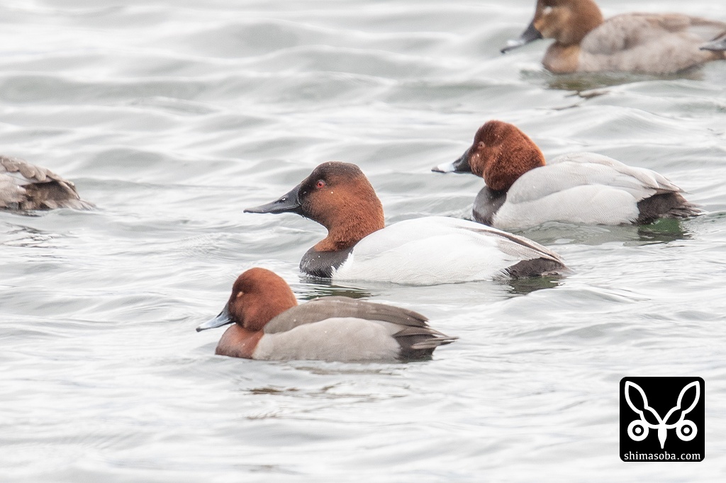 手前からメジロガモとホシハジロの雑種、オオホシハジロ、ホシハジロ。