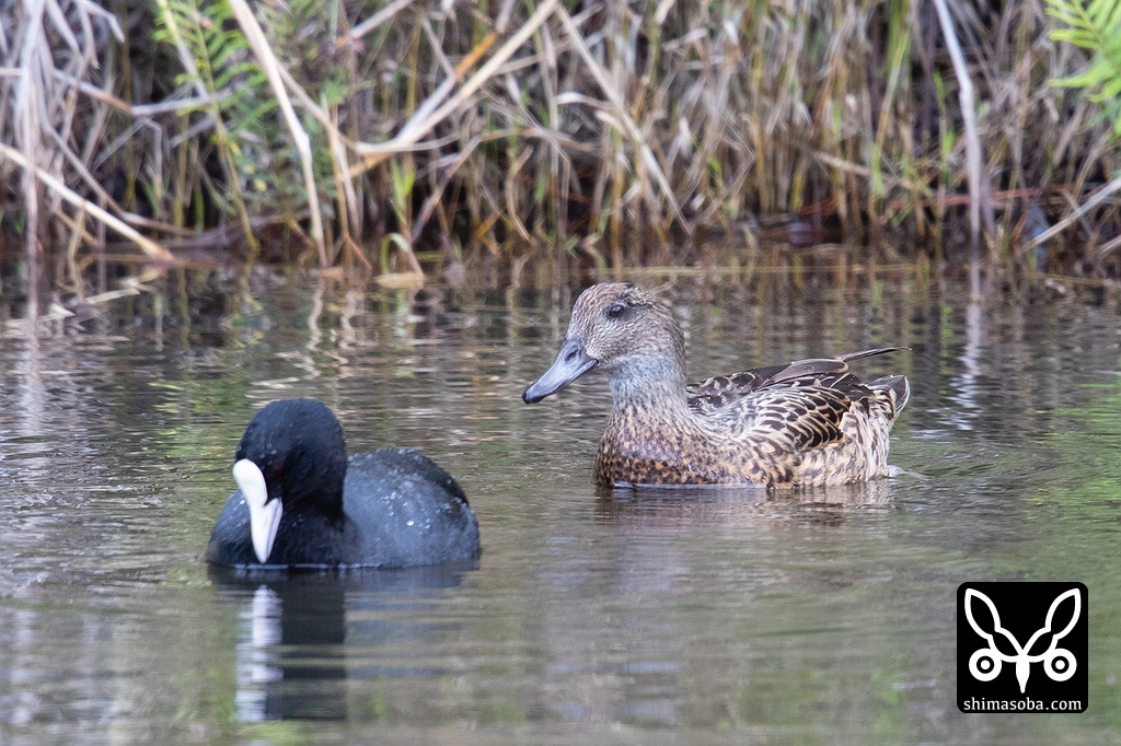 先日、オスとメスでいたヨシガモ がメスだけになっていました。他にいたヒドリガモやオカヨシガモも全ていなくなっていたのですが、ヨシガモのメスはオオバンたちと残っていました。先日見たとき、ヨシガモのメスが妙にオオバンの後をついて回っていておかしいなと思っていたのですが、どうもこのヨシガモのメスは種を超えてオオバンのことが好きになり残ることに決めたようです。^^;