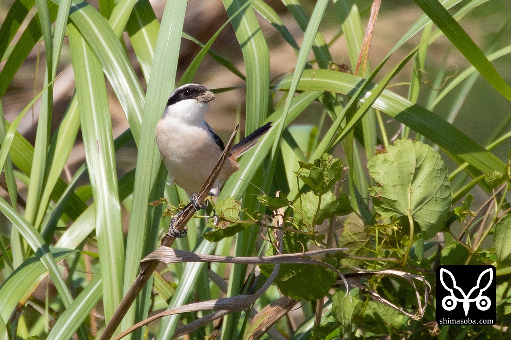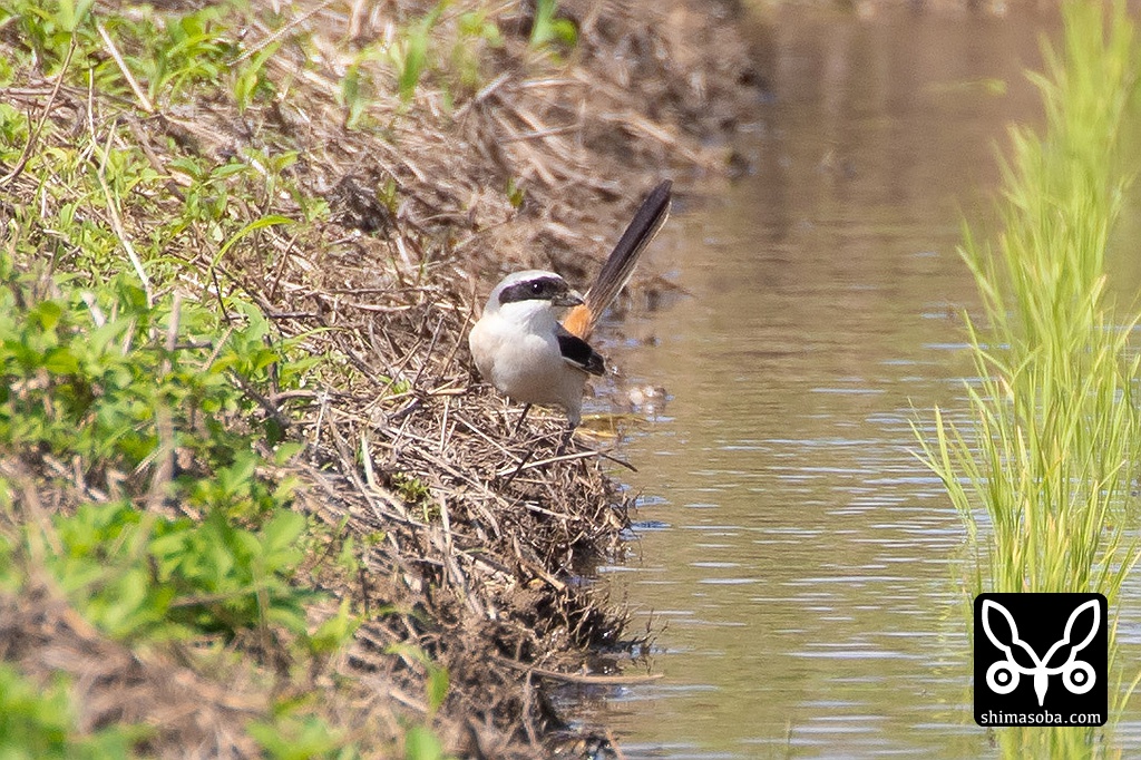 現場に着くとすぐに発見したのですが、田んぼに作業が入ってしまいタカサゴモズは田んぼ3枚分離れたススキに止まった。遠い。田んぼの作業も終わりそうにないので、農家の人に事情を話し農道に入らせてもらい近距離から撮影でしました。^^