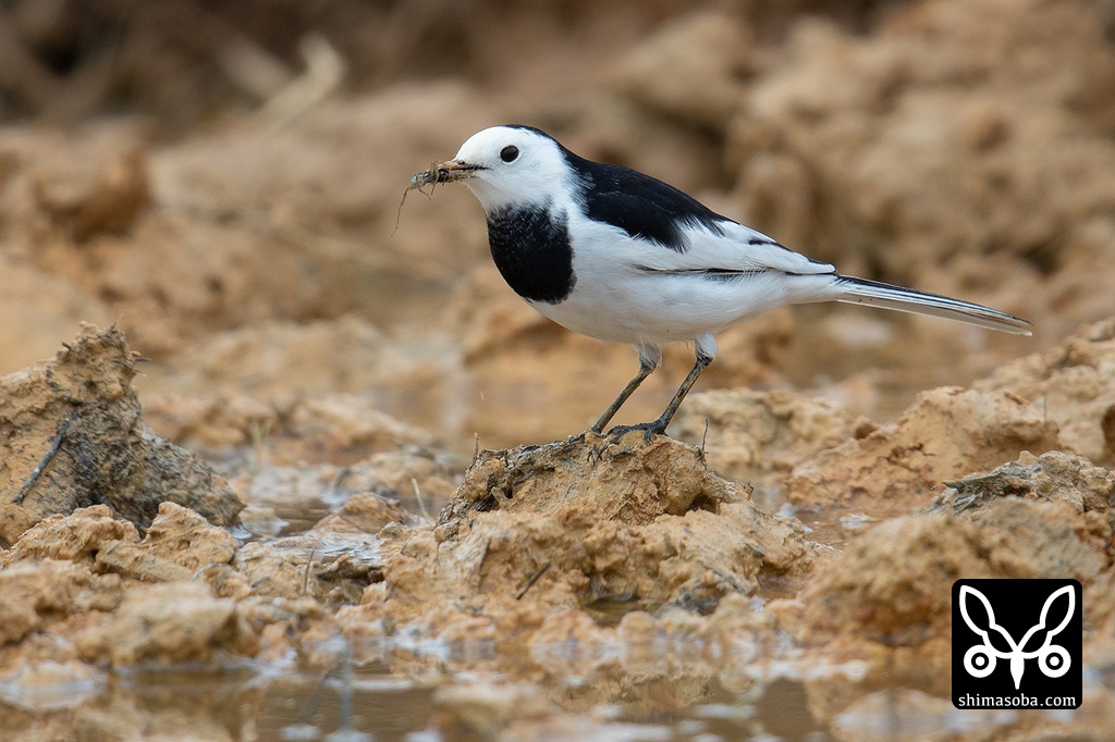 小さなクモを捕まえたホオジロハクセキレイのオス夏羽。